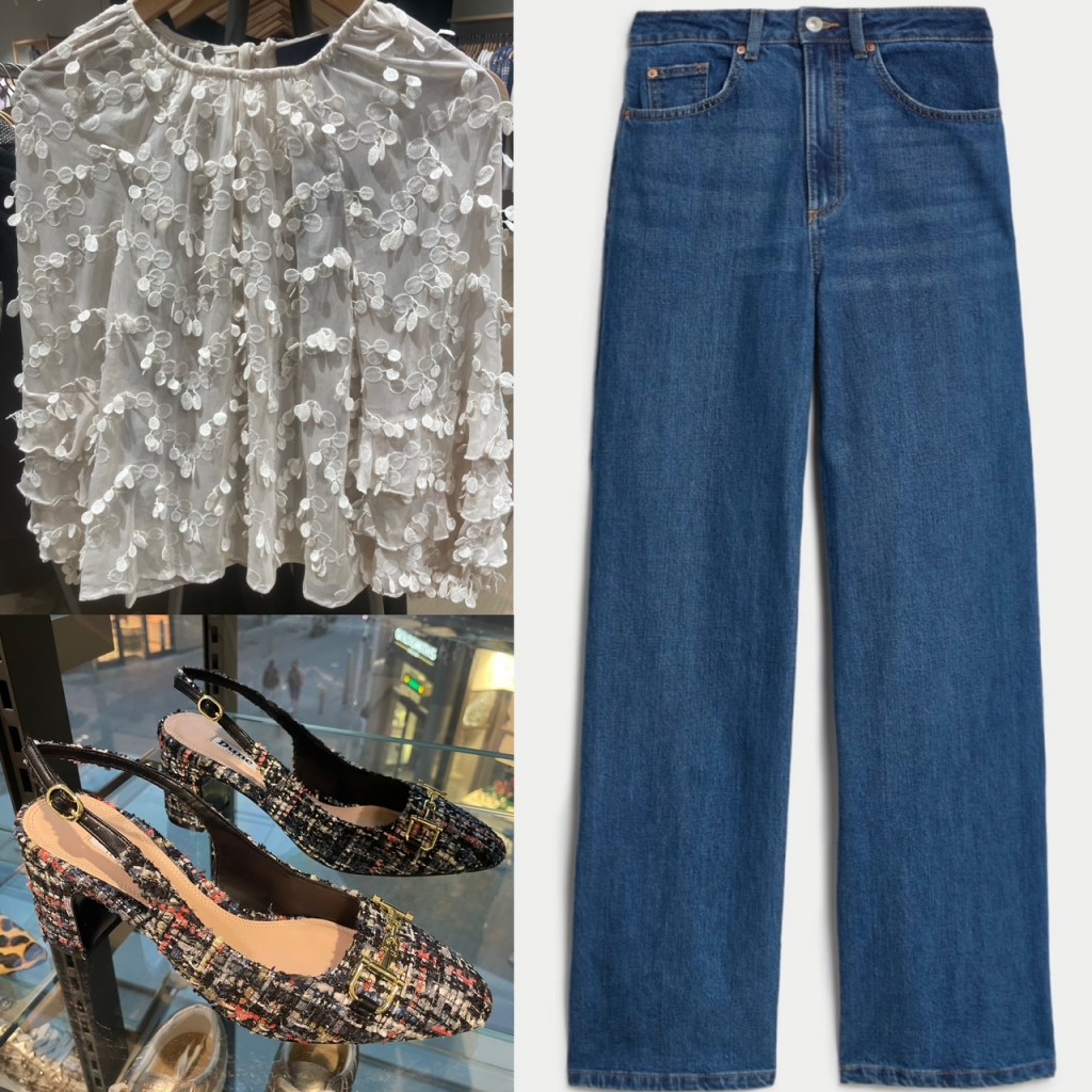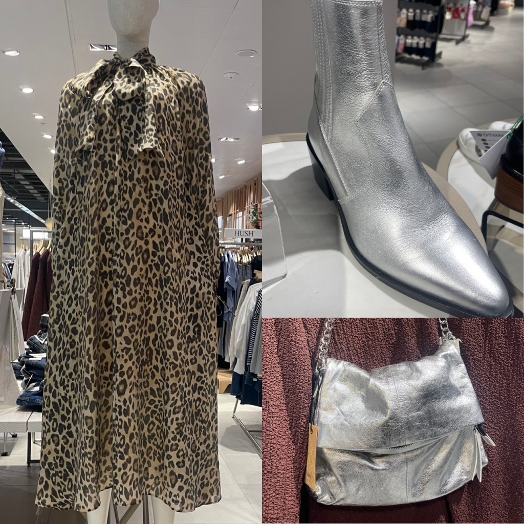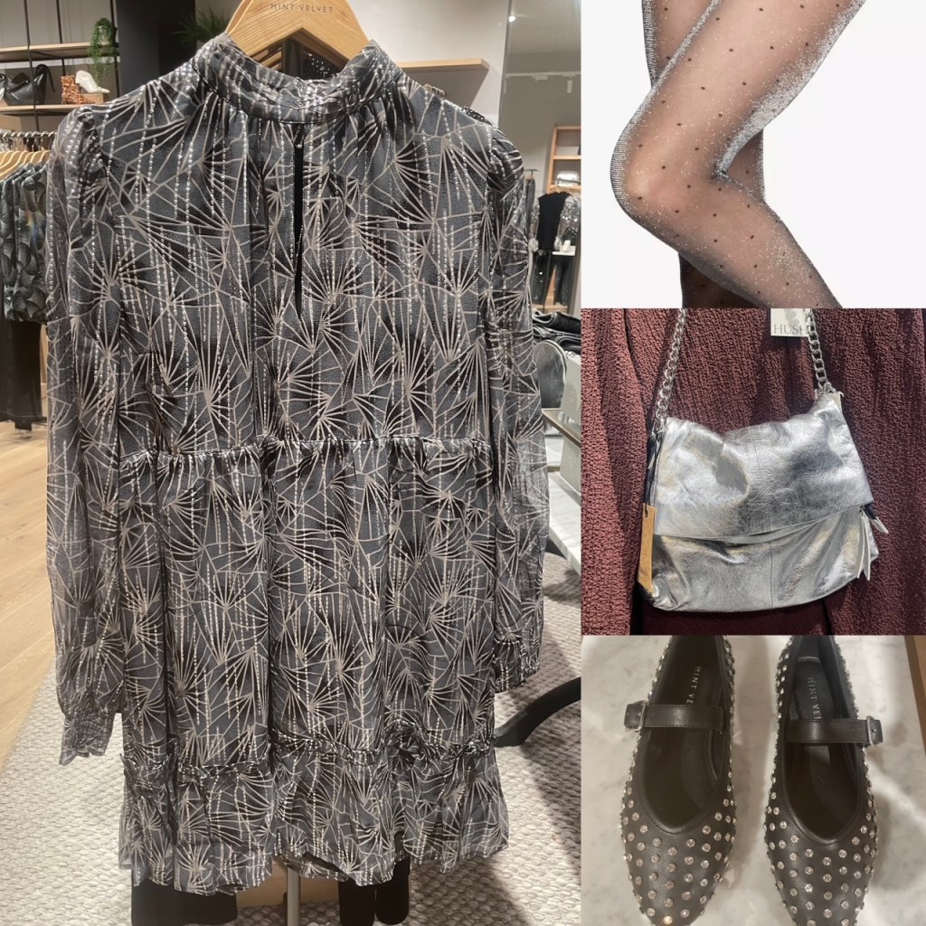 Pic 1 Silver Dress M&S X SIENNA MILLER £60, John Lewis Shoes Silver £85.00, Tights John Lewis, Silver Bag HUSH £105. Pic 2 White Shirt Nobodys Child, Shoes Mint Velvet. Pic 3 Dress M&S X SIENNA MILLER £90, Tights M&S, Sandals Dune £90.00. Pic 4 Dress Mint Velvet, Tights John Lewis, Shoes (as above) Bag (as above) Pic 5, Top Fat Face Ebb & Flow, Jeans Nobodys Child £79, Cardigan French Connection £75, Shoes M&S (was £39.50) Pic 6 Top Mint Velvet, Jeans The Wide Leg Jean M&S £35.00, Bag (as before) Silver boots John Lewis. Pic 7 Top Mint Velvet, Jeans The Wide Leg Jean M&S £35.00, Shoes Dune Choices Snaffle Slingback £35. Pic 8 And Or Dress £109, (Boots & Bag as before)